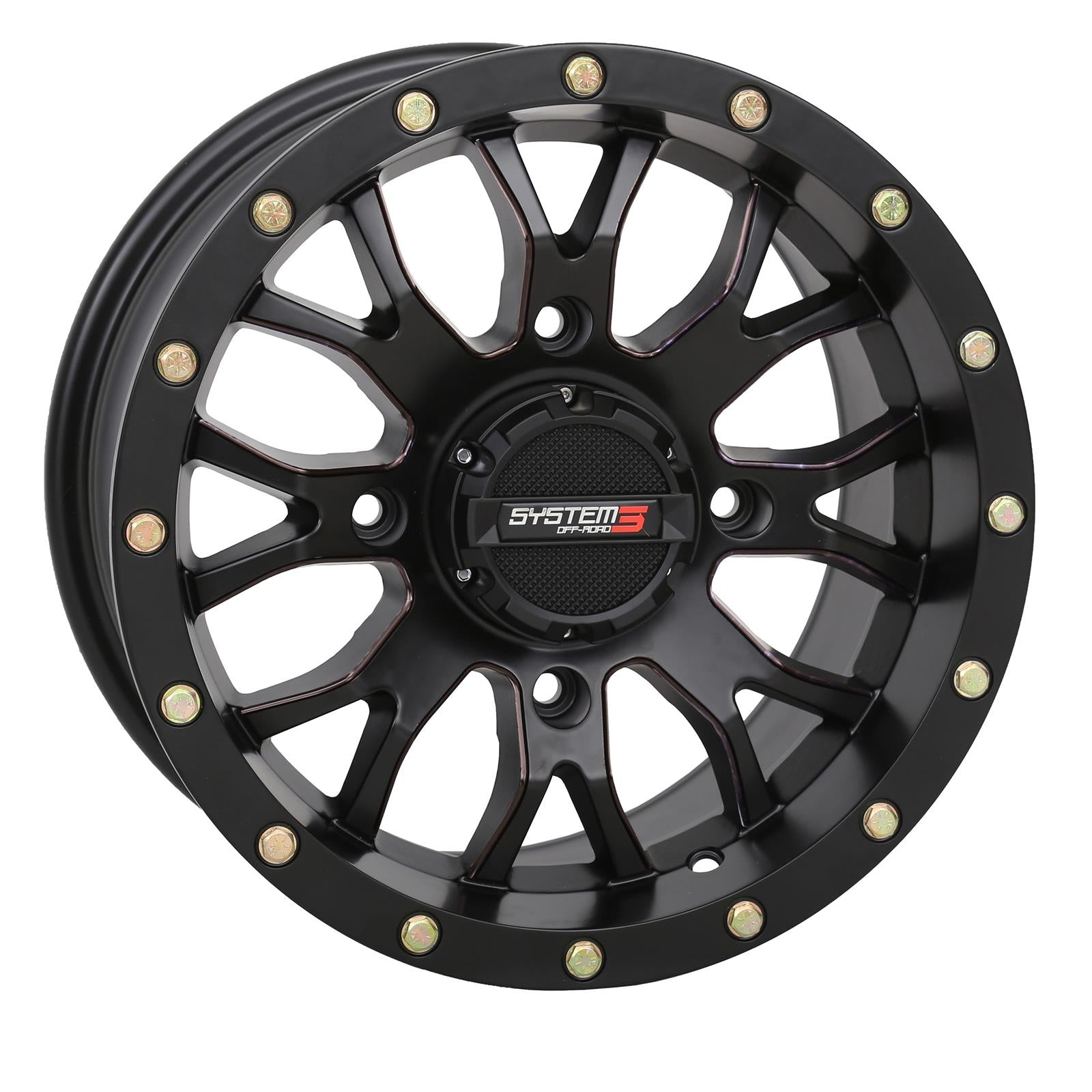 System 3 Off-Road ST-3 simulated beadlock matte black wheels fit your powersports machine with aggressive performance and style. The robust aluminum construction provides reduce weight, while the edgy design and faux beadlock provides rugged style. The ST-3 matte black wheels feature a heavy-duty inner and outer wheel lip, and a unique split 8-spoke design pattern that advances their style. Large O.D. lug holes accommodate most hex head lug nuts. The outer bolts are cadmium-plated for lasting durability. Each wheel has an overall 1,000 lb. load rating. These simulated beadlock wheels come in diameters, bolt patterns, and offsets to fit your application. A bolt-in style center cap with System 3 logo is also included with each wheel.